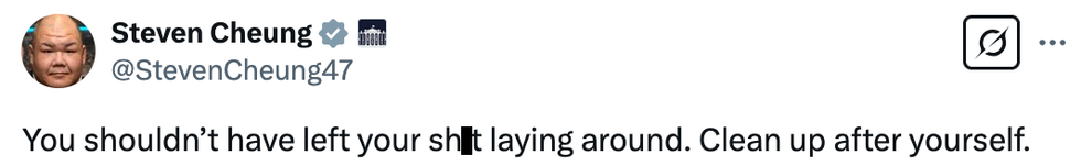 "You shouldn’t have left your sh*t laying around. Clean up after yourself," wrote Cheung.