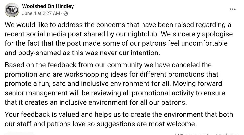 \u201cWoolshed on Hindley nightclub \u2018apologises for urging patrons to take off bras for free drinks.\u2019 Predictable flimflam non-apology: \u201cWe sincerely apologise for the fact that the post made some of our patrons feel uncomfortable and body-shamed as this was never our intention.\u201d\u201d— Kerry Pearce (@Kerry Pearce) 1685939241