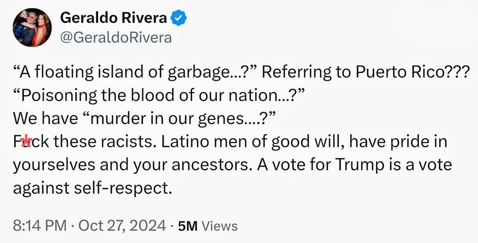 One critic of the Trump campaign's decision to add a bigotry-filled comedy set in their MAGA rally is former friend of Trump, Geraldo Rivera.