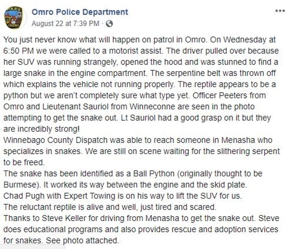 An unidentified woman recieved the shock of her life when she pulled over to check the engine on her SUV. It seems her car was running funny but what wasn't funny is what she found under the hood. The woman from Omro, Wisconsin called 911 when she found a python wrapped around her serpentine belt.