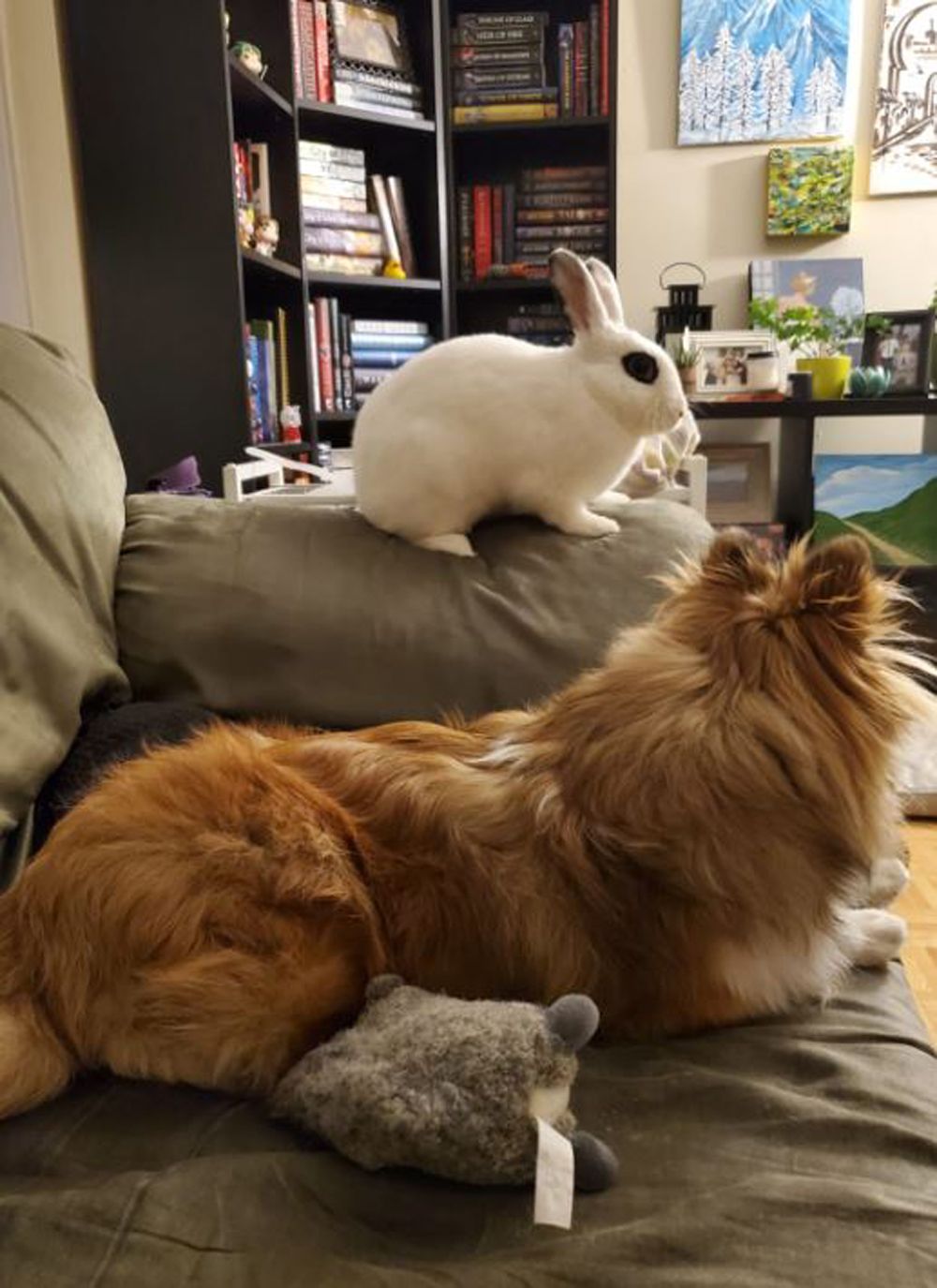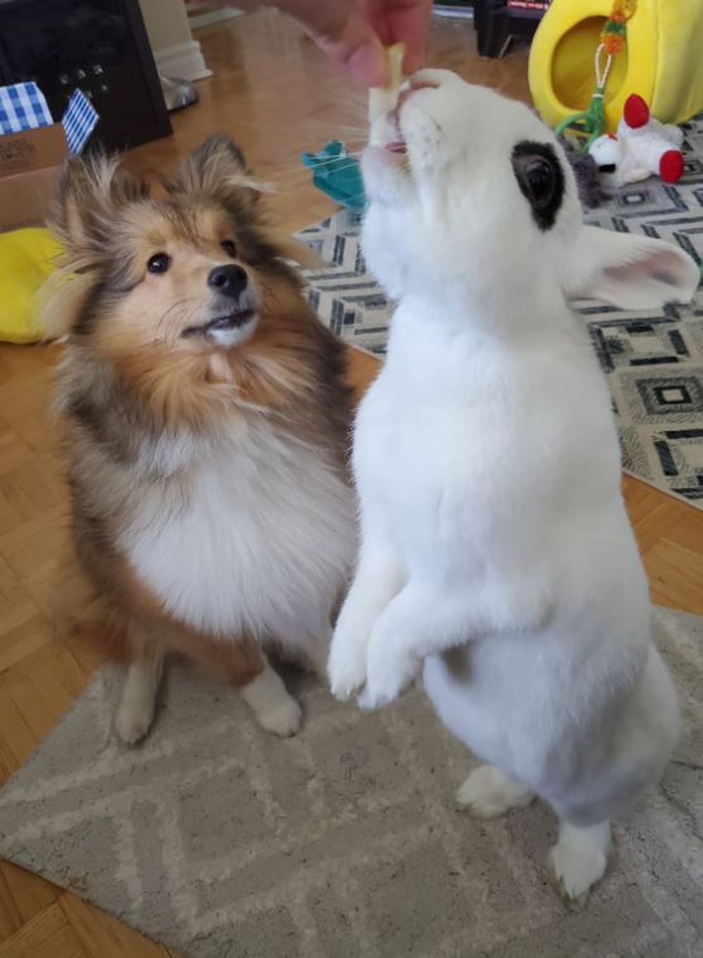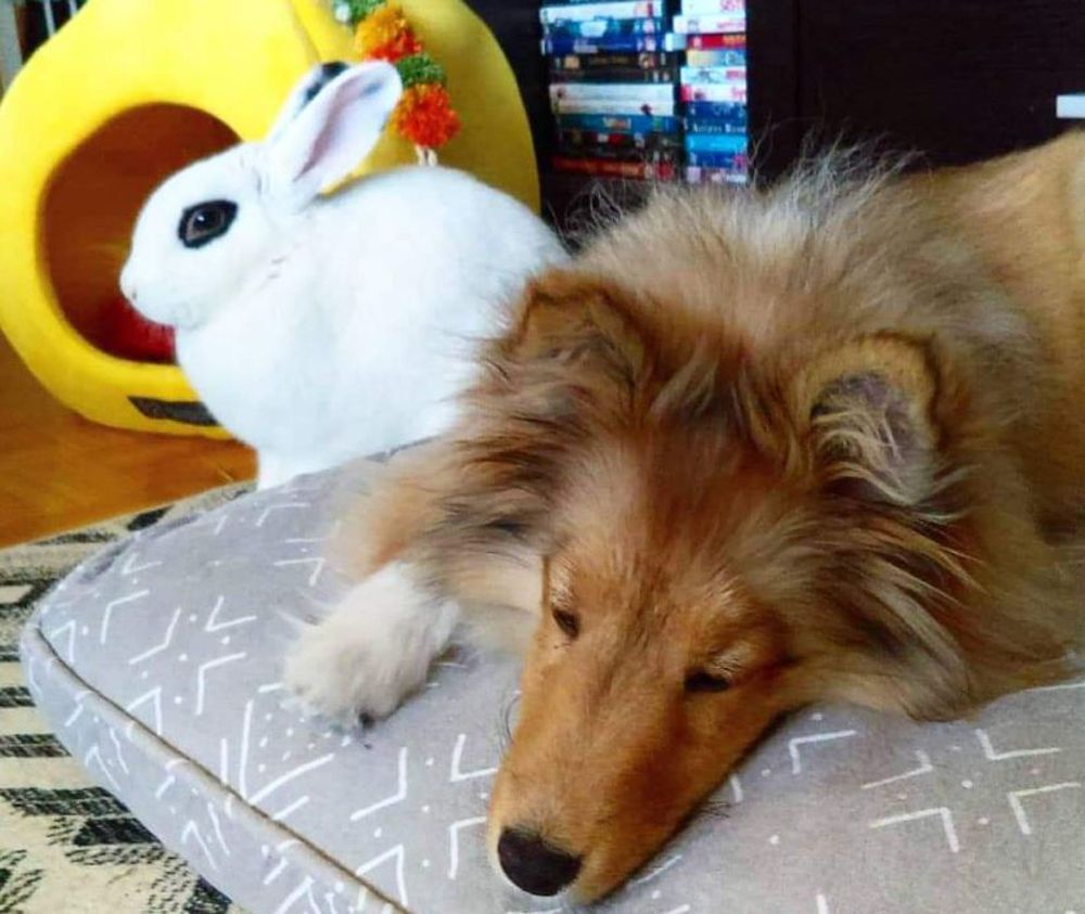 It may sound barking mad, but it was love at first sight for this rescue rabbit and Shetland Sheepdog when they first met earlier this year.