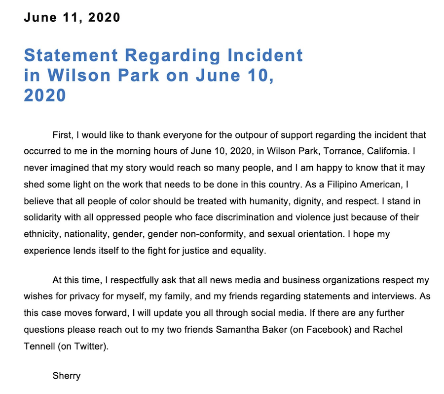 My friend was threatened in Wilson Park in Torrance, California today while she was working out in a public park by a Karen. She now does not feel safe to exercise in the park because of this. This is infuriating @TorranceCA @TorrancePD @ABC7 @CNN @LANow pic.twitter.com/JkZbRpODbA