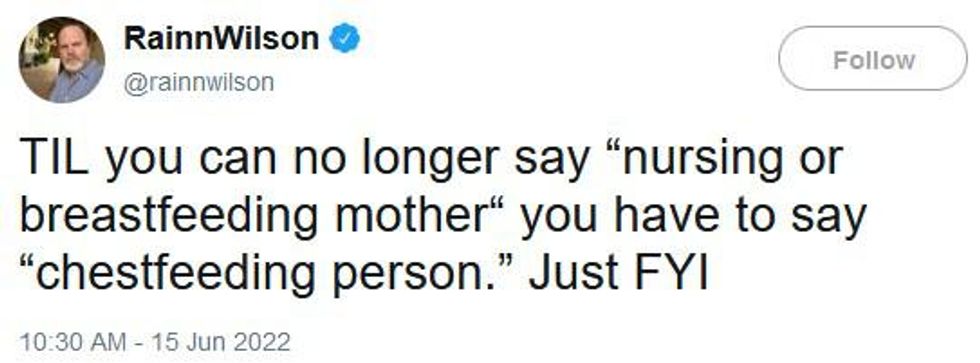 \u201cYesterday I tweeted a mean crack about breastfeeding vs chestfeeding. After speaking with some Trans friends and educating myself a bit more I want to apologize for the tweet. It was adding to misinformation and meanness. I\u2019m sorry.\u201d— RainnWilson (@RainnWilson) 1655393027