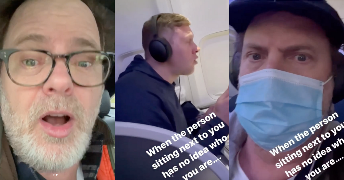 Last week, The Office star Rainn Wilson shared a video on Instagram that quickly went viral of an oblivious fan sitting in the seat beside him on a plane.