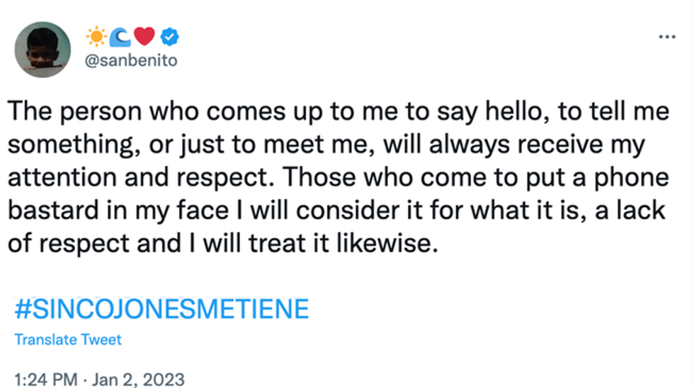 His hashtag, #SinCojonesMeTiene, is a colloquial phrase that means something like "it doesn’t scare me" or "I don't care" based on the context.