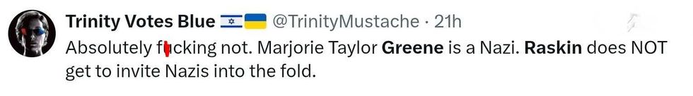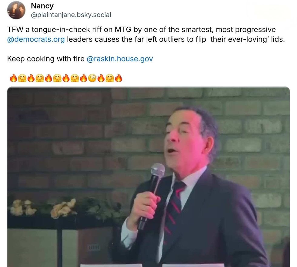 And it doesn't matter if Raskin was joking about it or not. That's the problem: everyone wants to joke, everyone wants to be a comedians but real people's lives are on the line and Marjorie Taylor Greene helped put them there. This is not a joke: