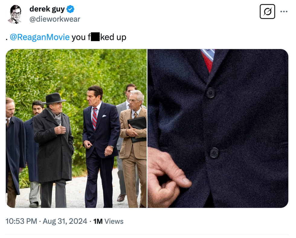 Even menswear expert Derek Guy observed how the costuming for Reagan went unchecked during production, and he highlighted inaccuracies.