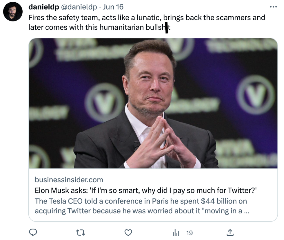 \u201c@cest_clerc @BusinessInsider Are you sure he didn't answer, "I was interested in \nmoving Twitter in a negative direction"?\u201d— Maud Clerc (@Maud Clerc) 1686995909