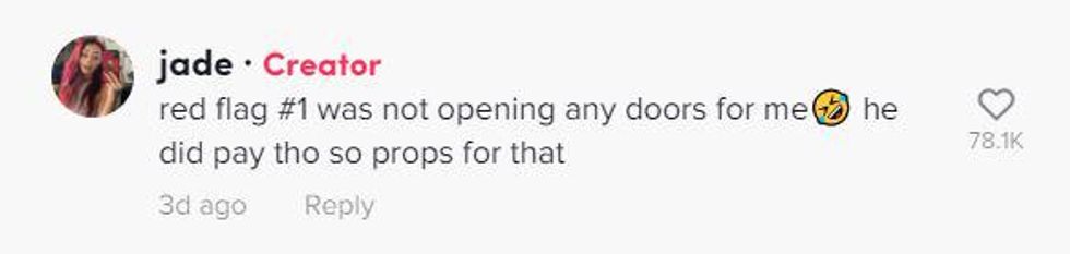 Jade commented that the first red flag was when her date didn't open the door for her, but he did pay for her dinner.