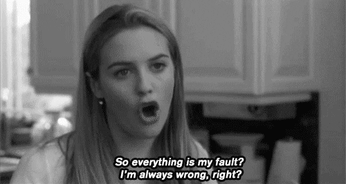 GiphyEverything is your fault. You're always the bad one, they're always the victim. Everything is turned against you. If you feel like that, even if you think it's true and you deserve it, YOU DON'T. Guilt-tripping and gas-lighting. You get out of that toxic relationship. You deserve to be treated better than that, whether you believe it or not.