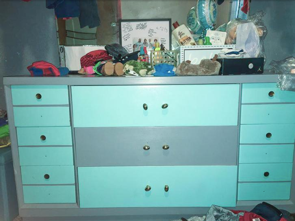 Well, the original poster of the photo settled all the debate by claiming that, yes indeed, the dresser is actually blue and grey: