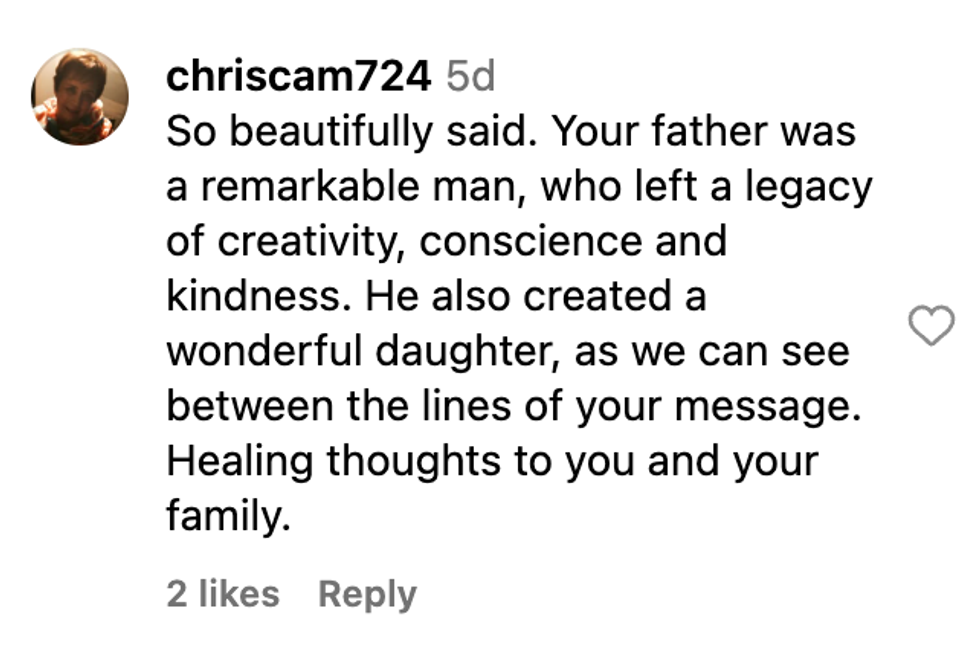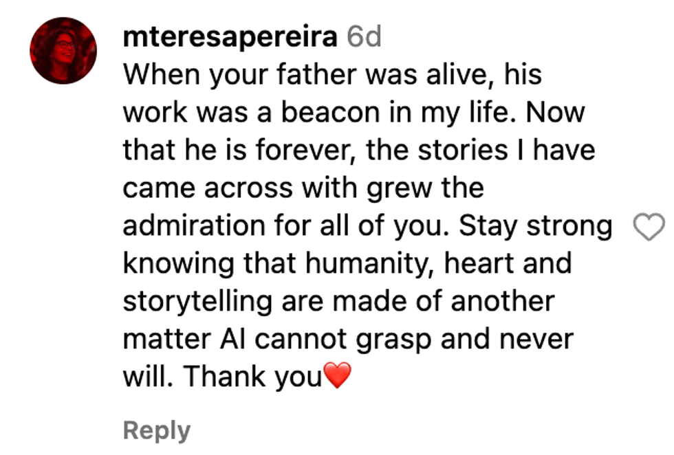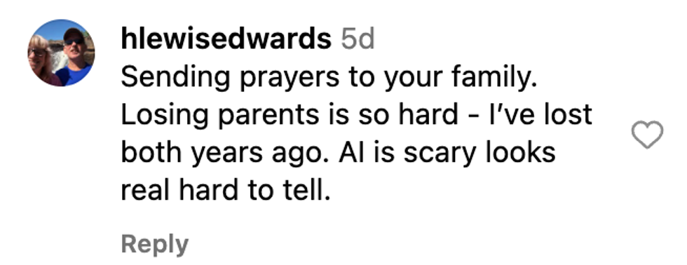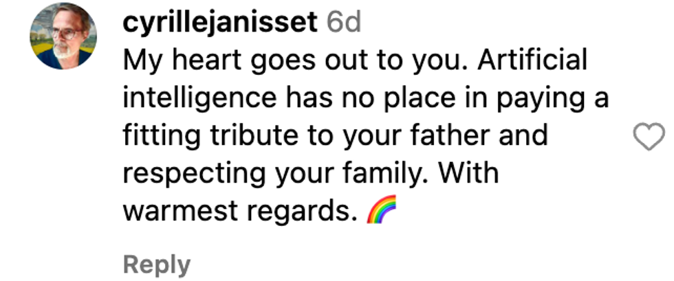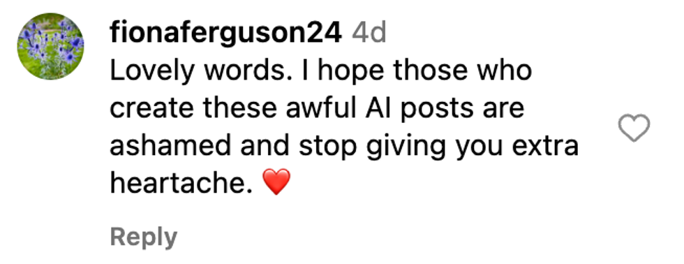 “There have been multiple AI versions of funerals, tributes, and quotes from members of my family that are fabrications. Renderings of my Dad who clearly has no say, and depictions of my family that do not represent anyone in a positive light are extra challenging during a difficult time. We are grieving together, and we are all in support of one another.”