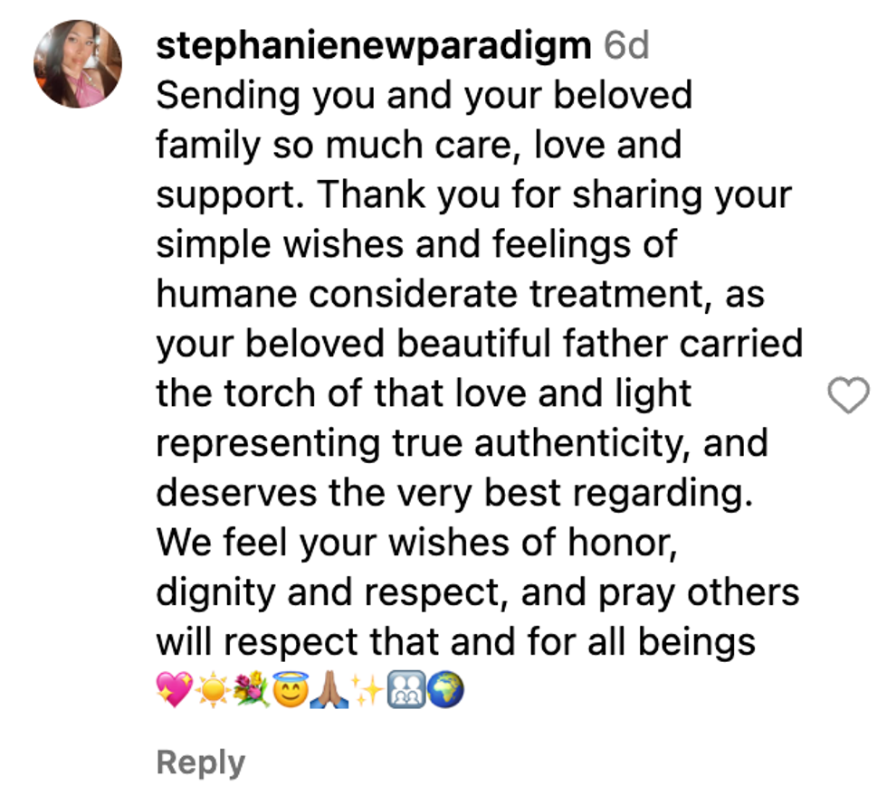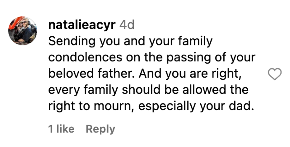 "We have not had a public funeral, we are working out our plans for a memorial in the future. Every family should have the ability to mourn, represent the person they lost, and pay homage in a way that fits their values and family culture best."