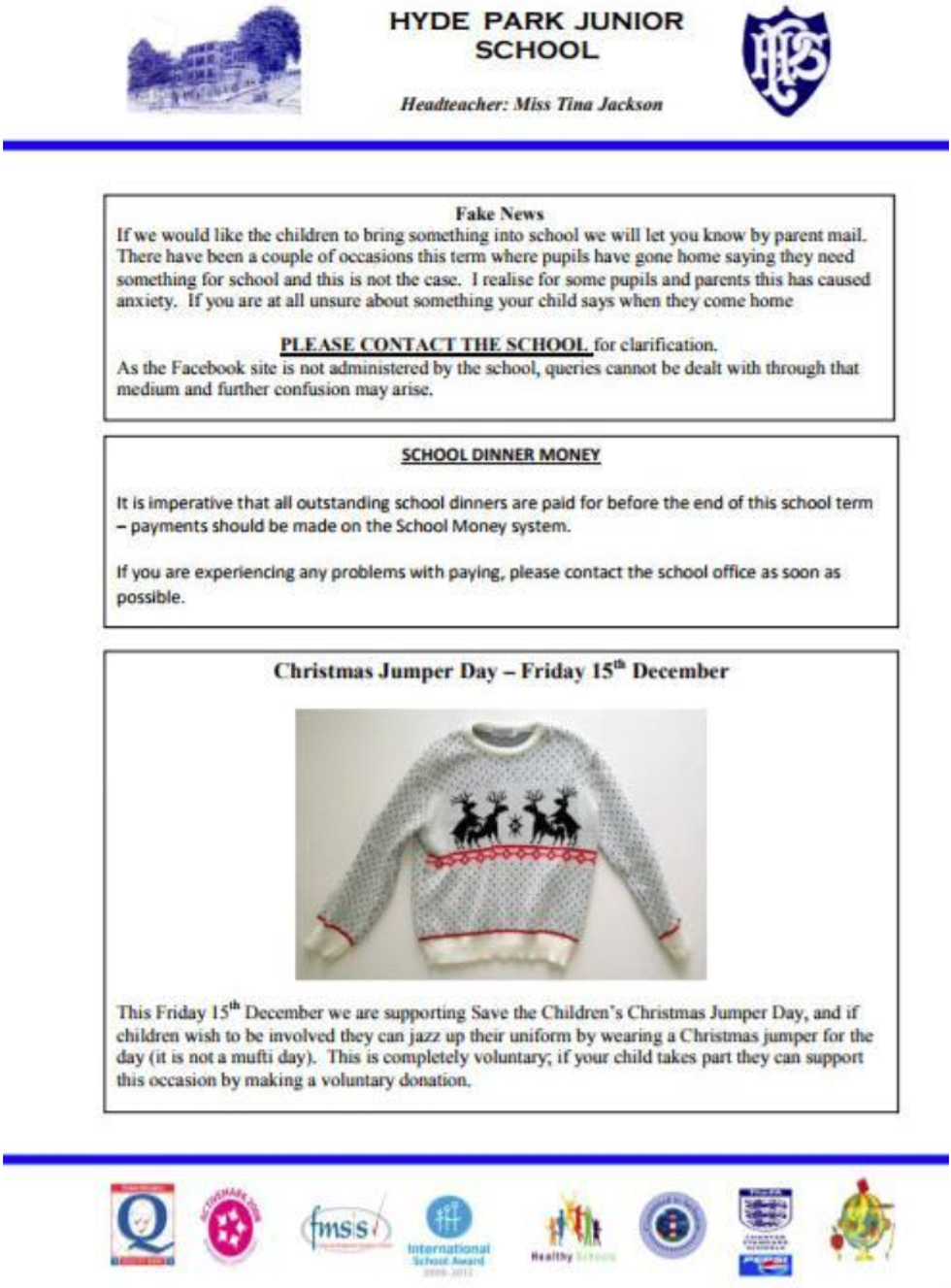 The image, which was sent as part of an online newsletter sent out by Hyde Park Junior School, was meant to promote a charity "Christmas jumper day" in which students were encouraged to "jazz up" their school uniforms with festive sweaters.
