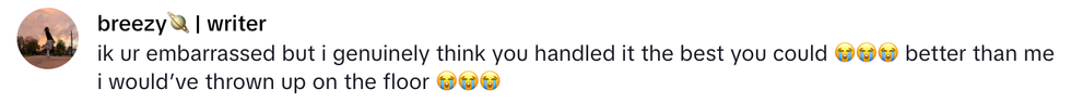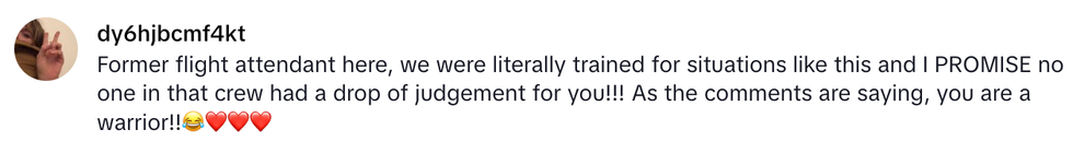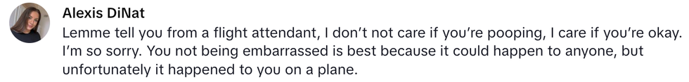 While showing only a bit of secondhand embarrassment, the flight attendant handed Reinertsen several barf bags. The rest of the flight crew offered the passenger some ginger ale and reassurance that the airline had received clearance to land while Reinertsen was crouched over her temporary toilet room. Phew!