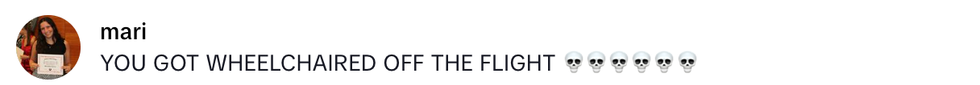 Patient zero was finally wheeled out and dropped off at baggage claim… in front of fellow passengers who were eyeing (also, probably smelling) her.