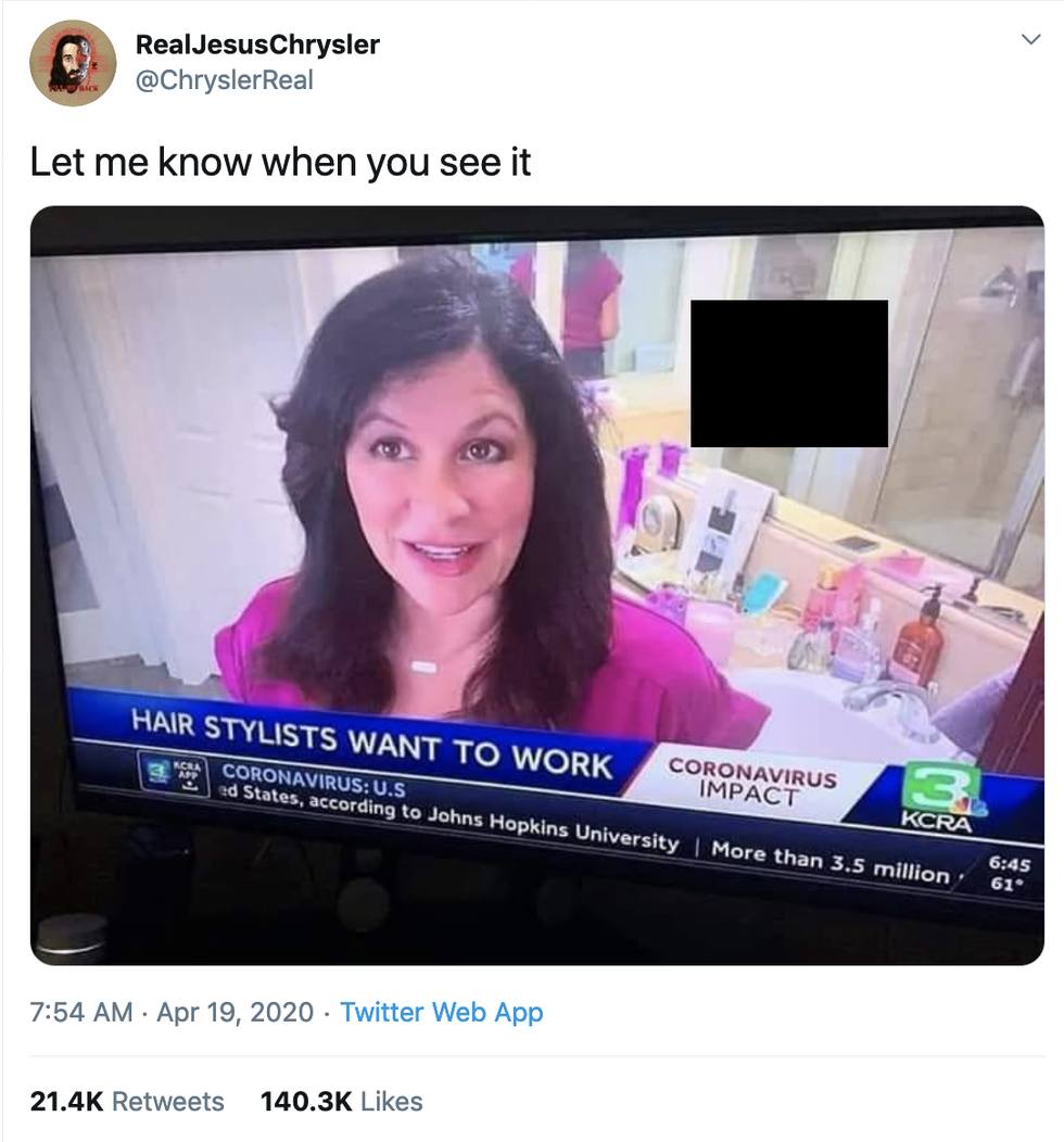 Melinda Meza of Sacramento's KCRA3 in California – which is currently in lockdown due to the pandemic – should have double-checked her surroundings before filming a live broadcast while cutting her bangs in the bathroom.