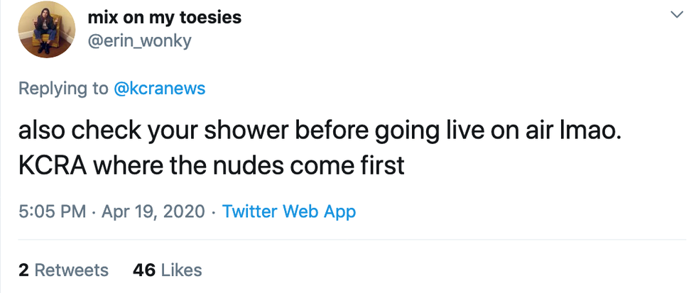Here's a shout out to KCRA 3 and their reporters for giving us their very revealing reports from their homes.