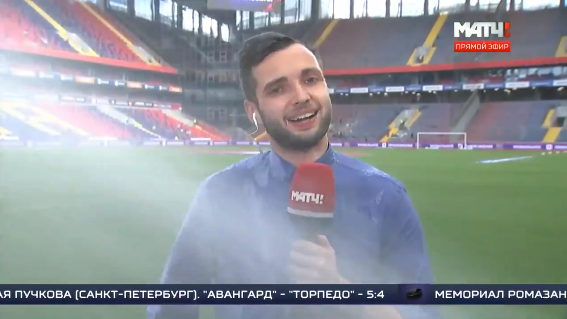 Evgeniy Evnevich was presenting for Match TV pitchside at the VEB Arena before CSKA Moscow's home game against Akhmat Grozny when the grounds' watering system tracked directly across where he was stood.