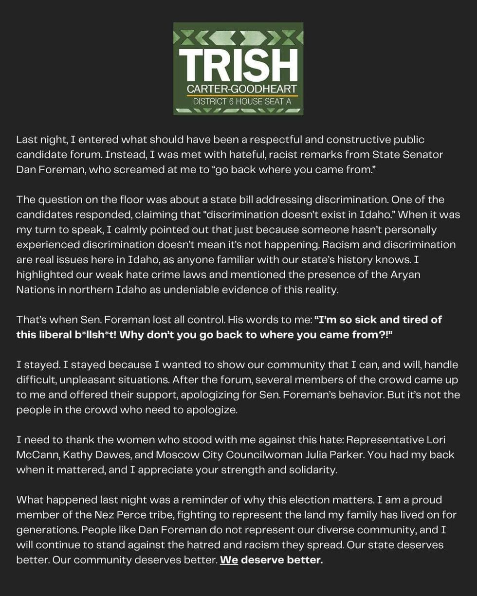 On the night of October 1, at a “Meet Your Candidates” forum held at the VFW hall in Kendrick, Latah County, Idaho, incumbent Republican state Senator Dan Foreman yelled "go back to where you came from" at Democratic state house candidate Trish Carter-Goodheart before storming out.