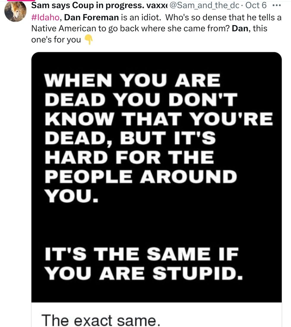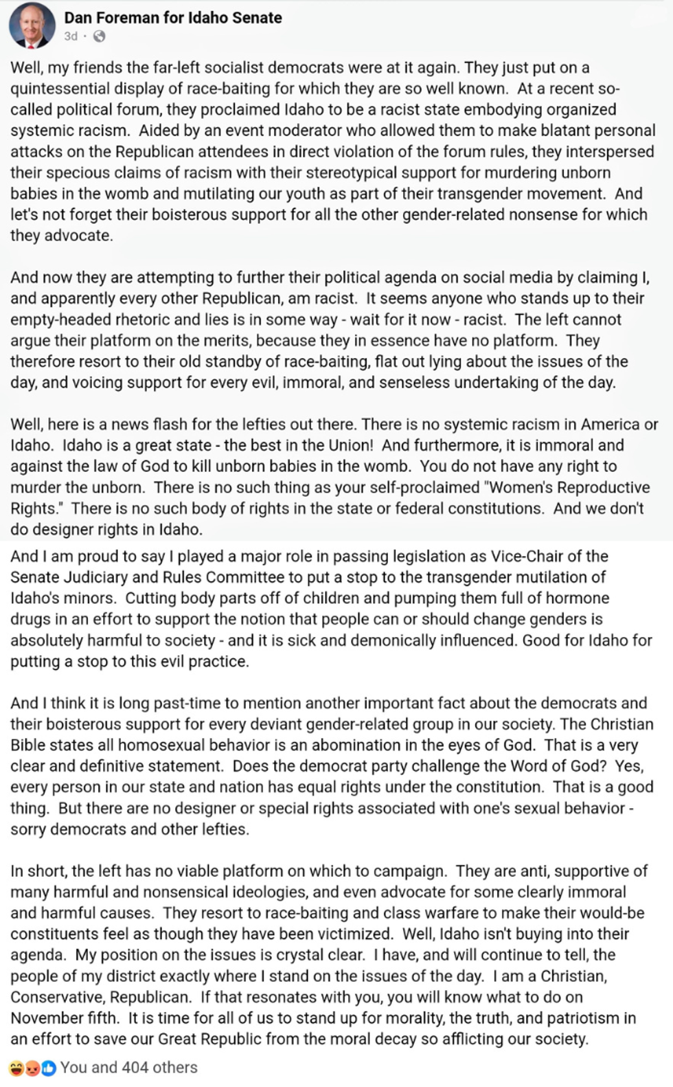 In September 2017, Latah County Sheriff’s Office bodycam caught Foreman screaming at a voter who dared express their opinion.