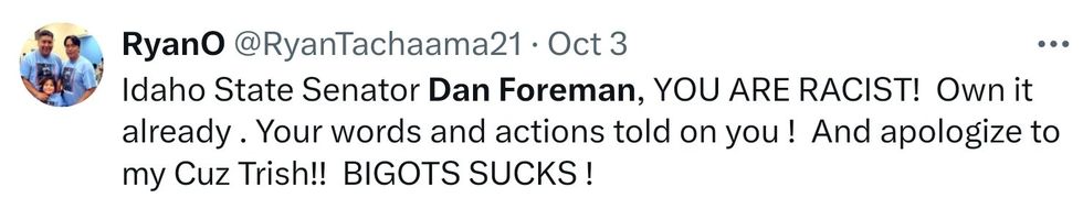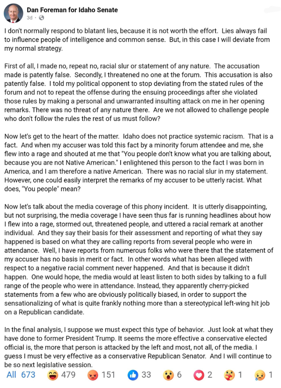 She stated she still hopes for a phone call and an apology or an opportunity to have a discussion with Foreman to acknowledge people are experiencing racism in Idaho.