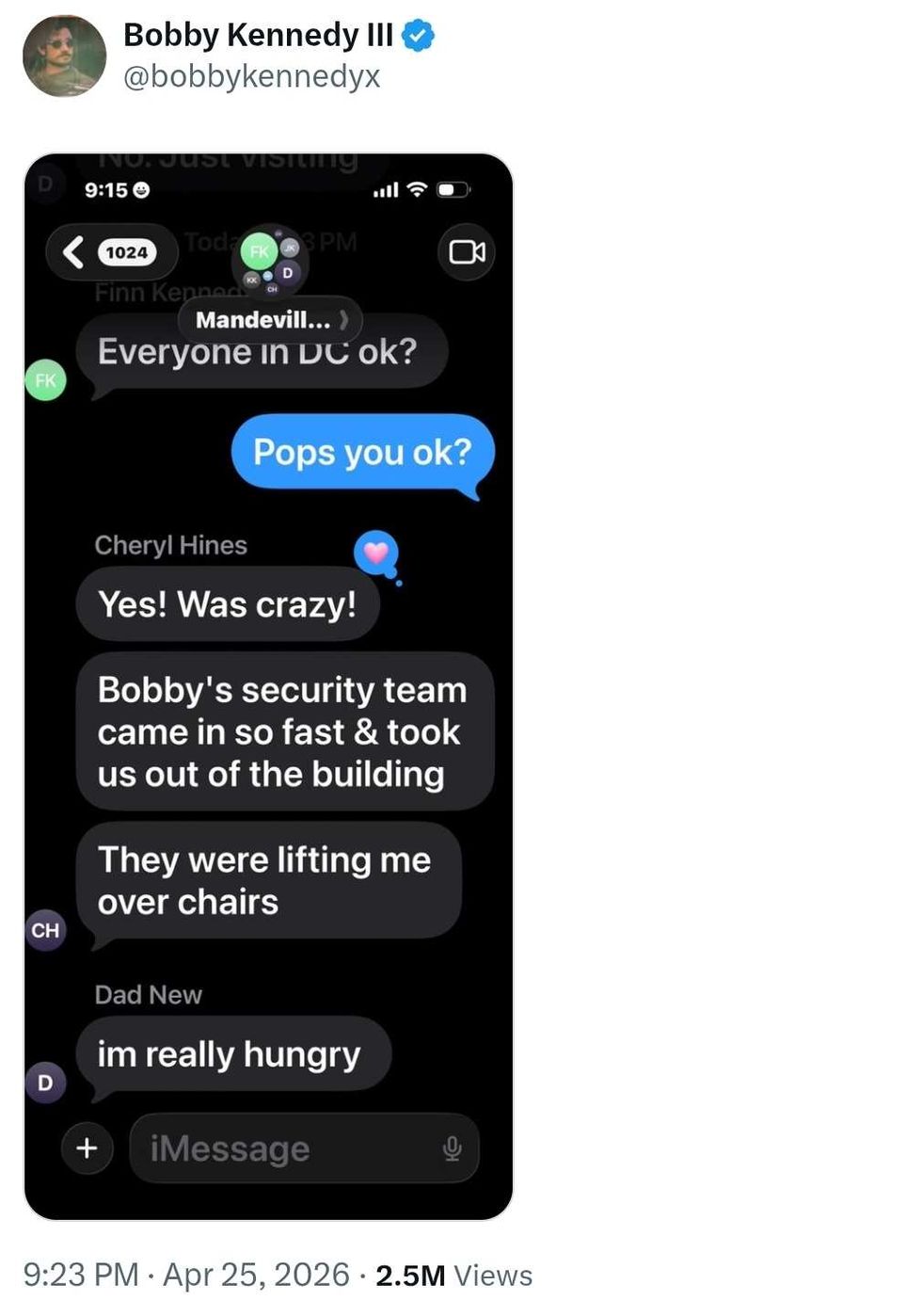 Bobby Kennedy shared a screenshot of his father's message on X. Concerned for his father, whose own father was assassinated in June of 1968 when RFK Jr. was 14 years-old, Bobby sent a message in the family chat.