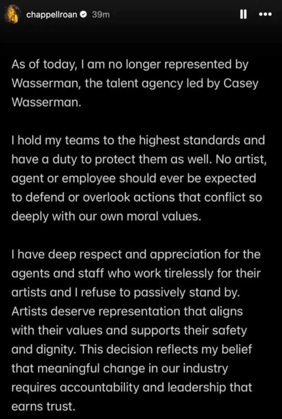 "Artists deserve representation that aligns with their values and supports their safety and dignity. This decision reflects my belief that meaningful change in our industry requires accountability and leadership that earns trust."