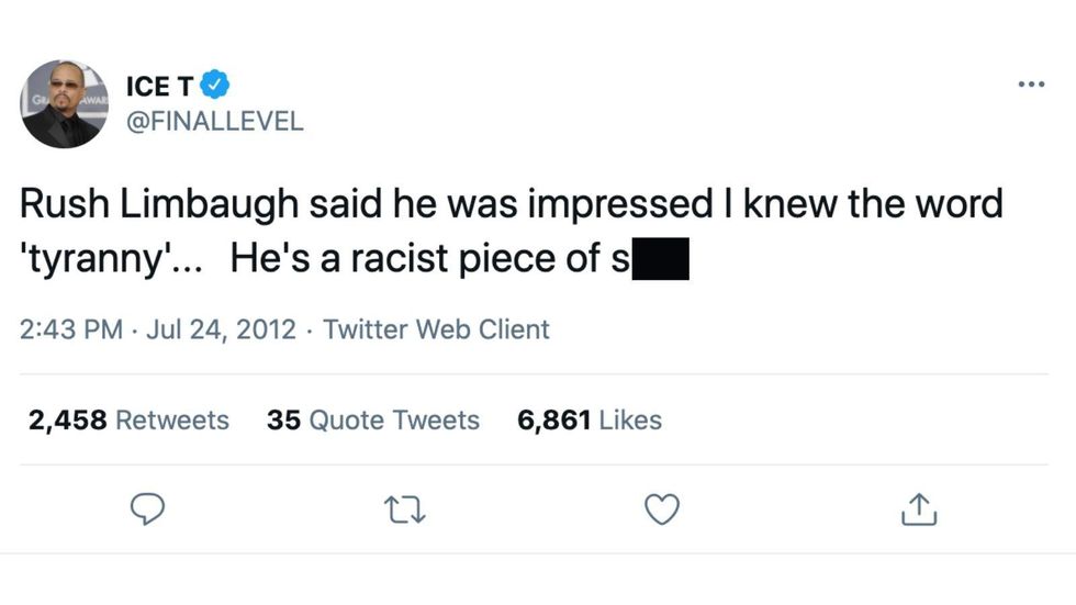 Rapper and actor ICE-T retweeted one of his own tweets from 2012 remembering a particularly racist moment from an interview with Limbaugh.