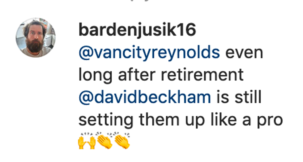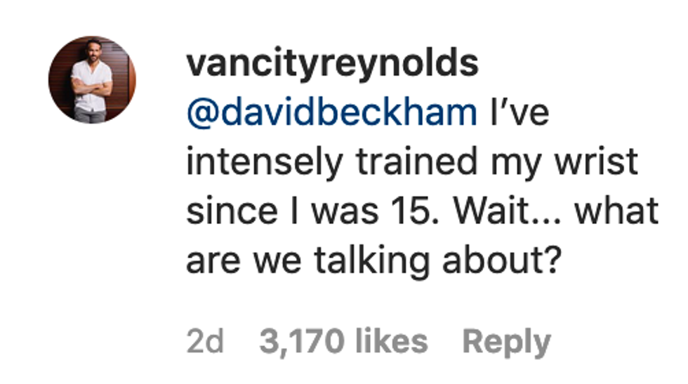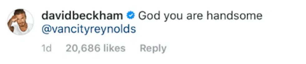Reynolds' bromance with Beckham has been going on for quite some time—as early as 2018 when Beckham commented on his mate's good looks on a post of Reynolds from the set of Michael Bay's 6 Underground.