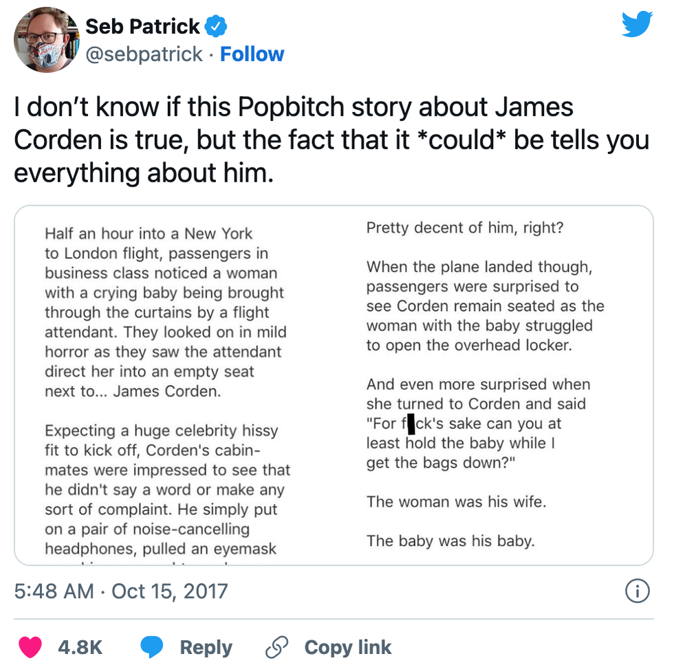 Upon learning of this behavior, many took to Twitter to remind us of the 2017 airplane incident, in which Corden puts on headphones to drown out the screams of the baby next to him only to find out later that it was his own child.