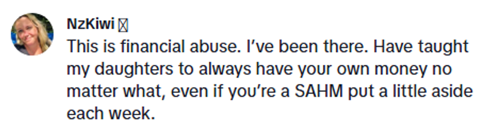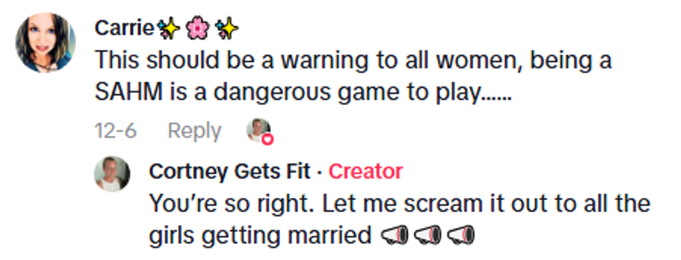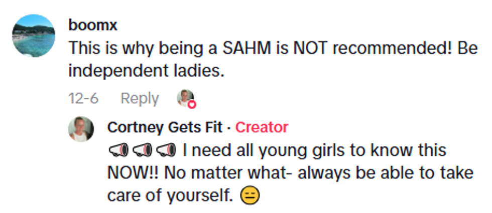TikToker @cortneygetsfit was in total agreement with the individuals who said that this was the exact reason that women, particularly stay-at-home moms, should not depend entirely on their husbands. Even in the best relationships, that's technically financial abuse, as the wife has no access to money that could be the difference between life and death.