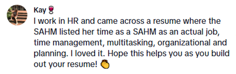 She'd been out of the workforce for about ten years, in preparation for having children, raising them, and caring for their home. She didn't have any separate savings, and she hadn't worked from home outside of her duties as a stay-at-home mom.