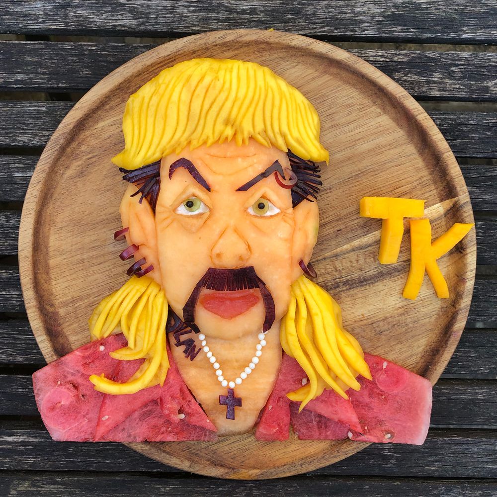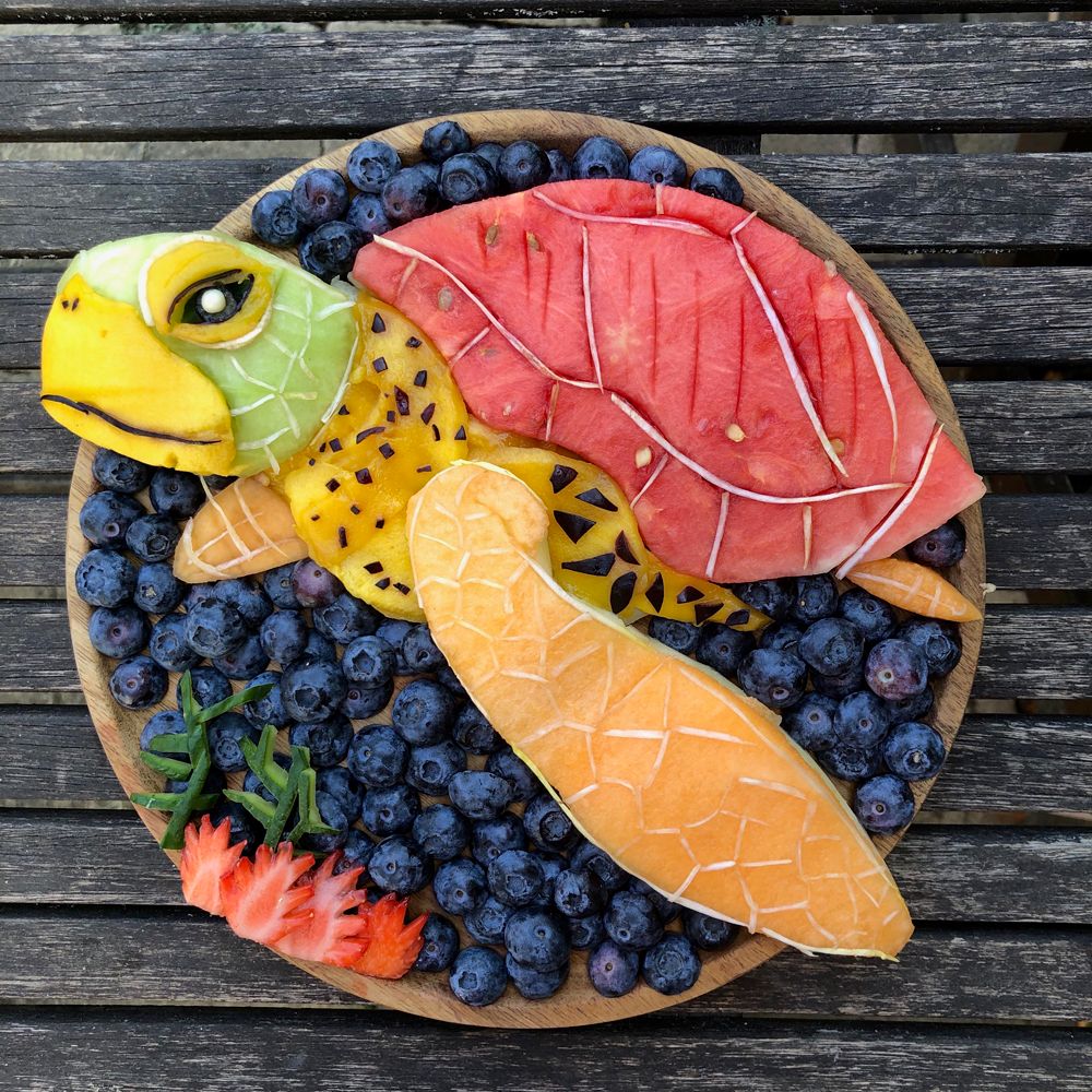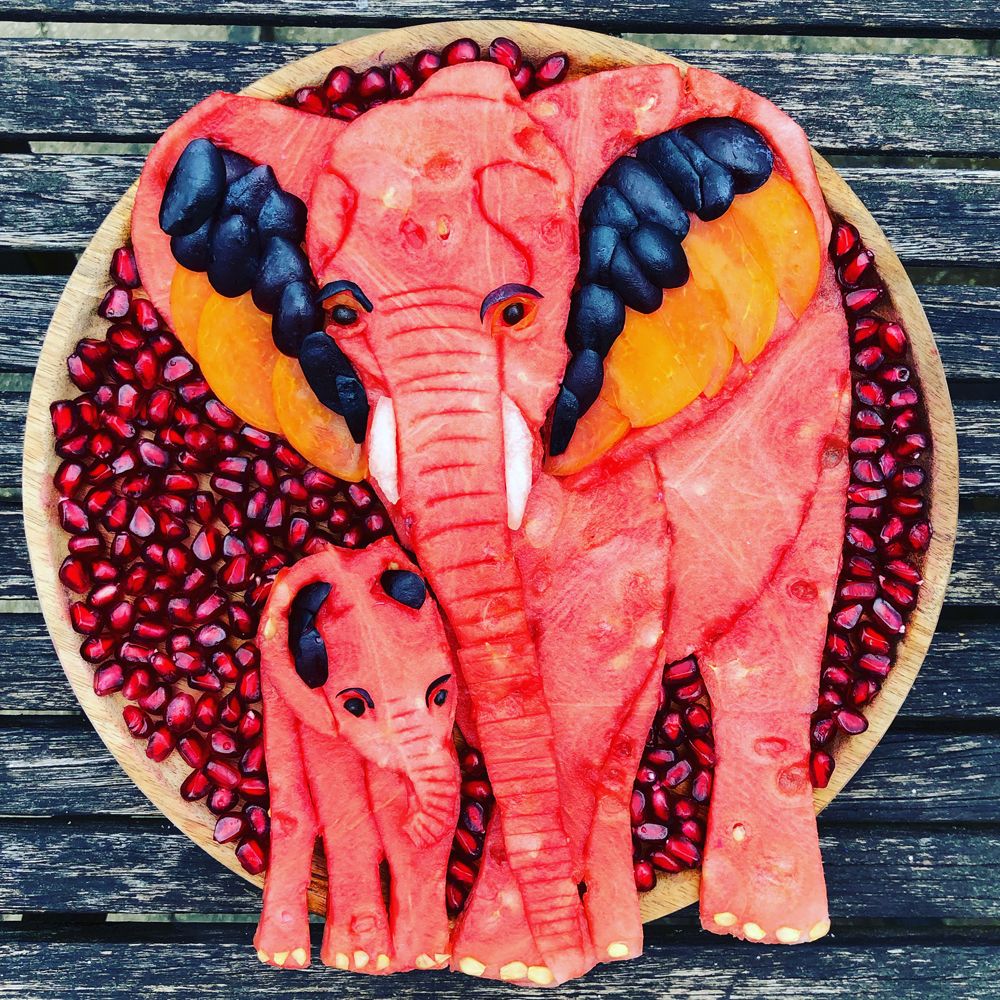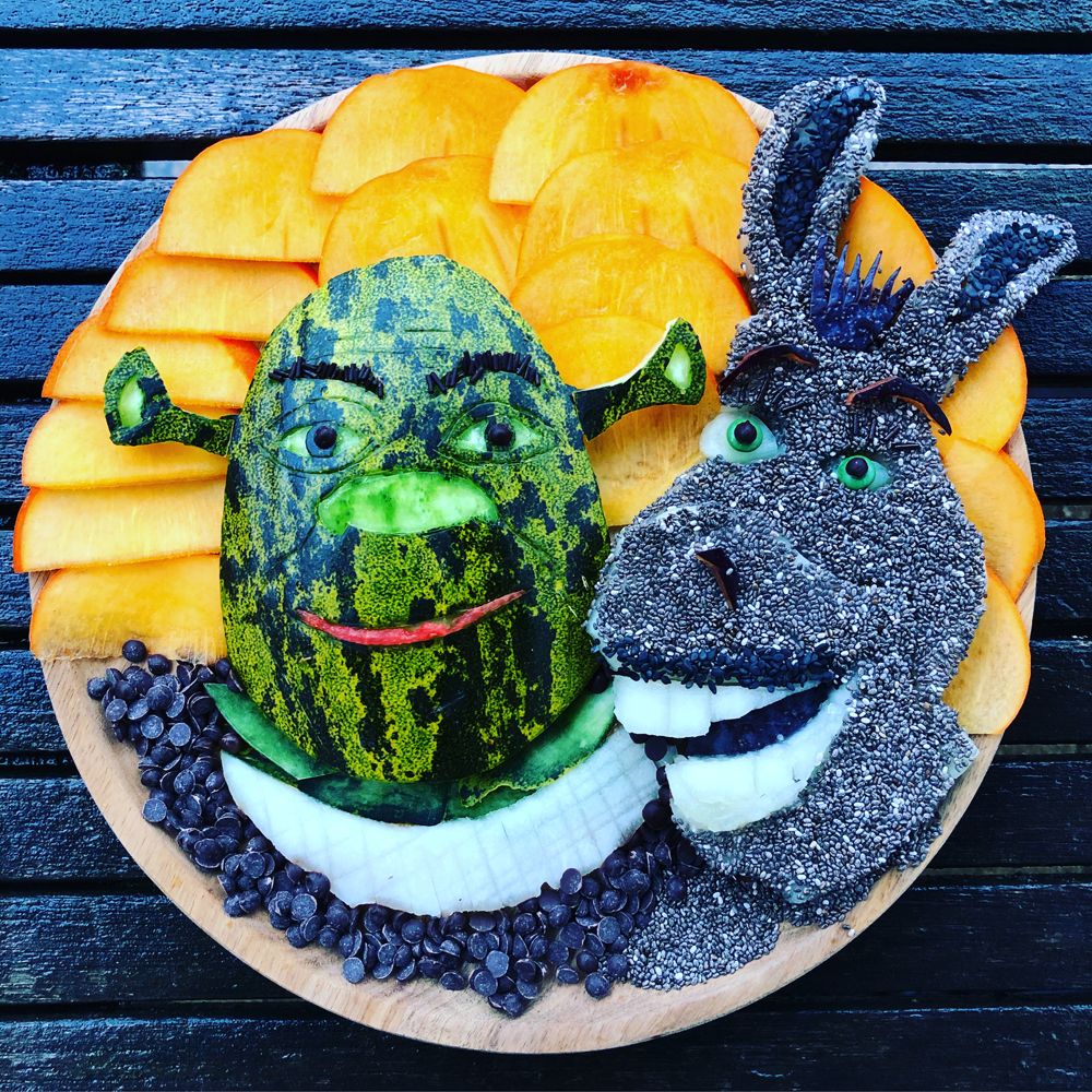 Juggling work with raising two small children, life was busy for Sarah, and she started to play around with fruit while relaxing with a glass of wine in the evening, creating her first edible portrait – a shark made of melon followed by a Minion from the animated movie Despicable Me – in Spring 2018.