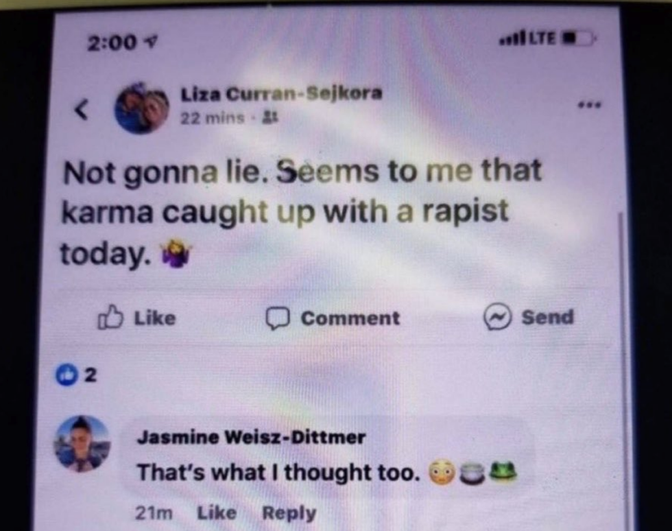 "Not gonna lie. Seems to me that karma caught up with a rapist today."