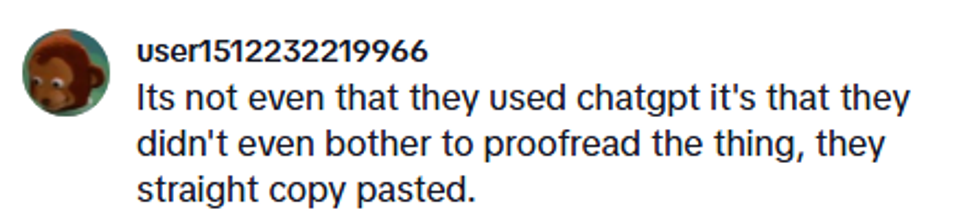 That's right: someone had not only asked ChatGPT to write about the Future Farmers of America group on their school campus, but they also did not proofread the body of text, including not removing ChatGPT's prompt at the end, which immediately clued everyone in on the nature of the text.