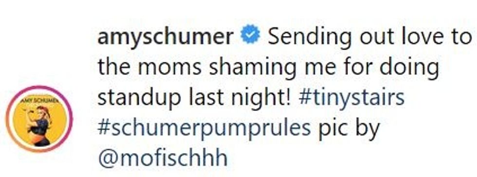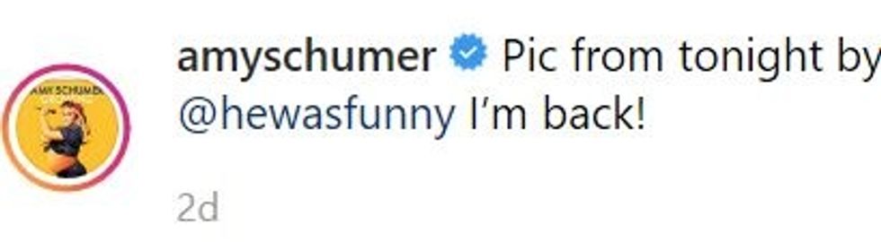 This week Schumer shared an image of her first night back on stage post-baby with her followers on Instagram, announcing in the caption, "I'm back!"