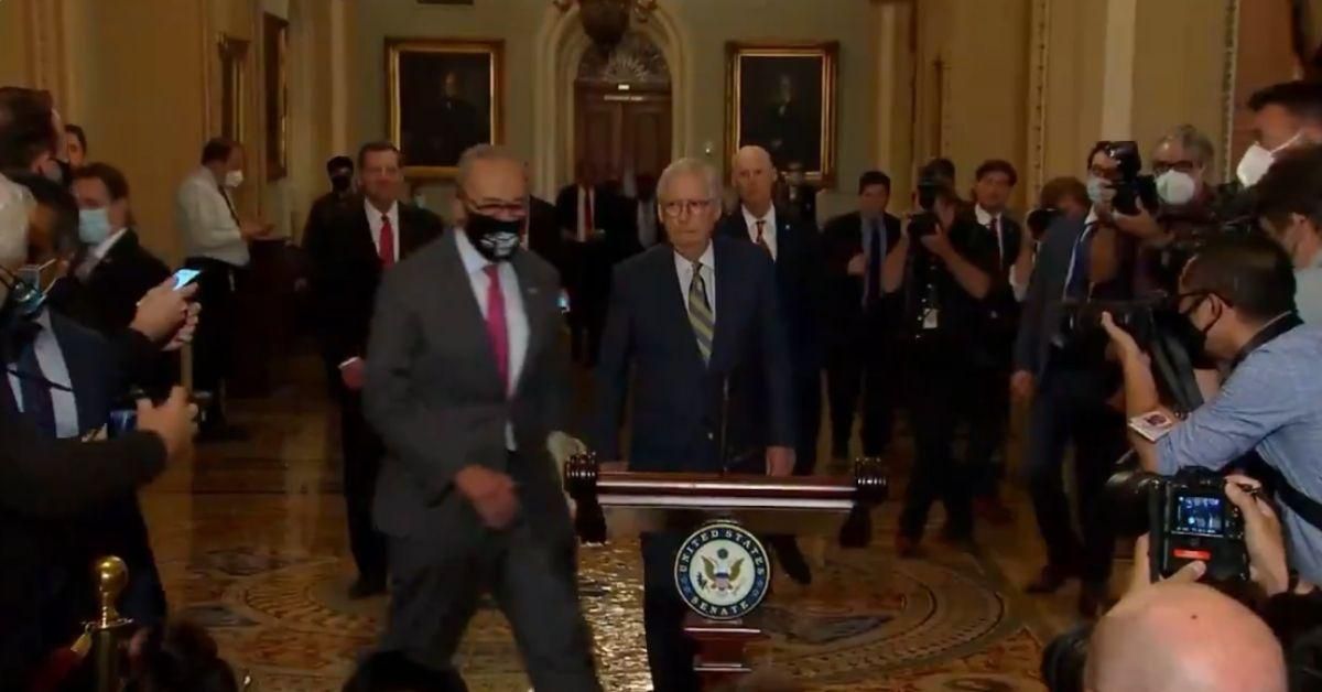 Liberals on Twitter are applauding Democratic Senate Majority Leader Chuck Schumer for what many saw as a power move that put Republican Senate Minority Leader Mitch McConnell firmly in place. The moment happened during a press conference at the U.S. Capitol this week.