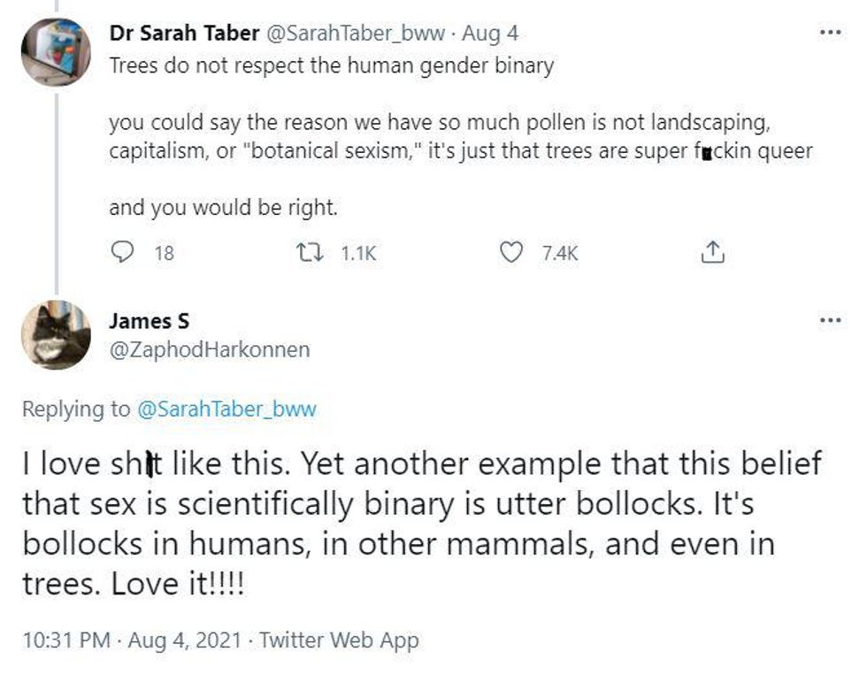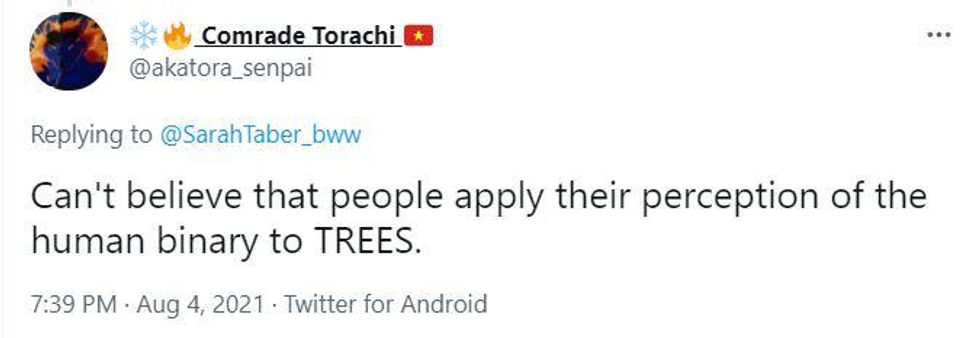 Intersex would be more accurate. Trees don't have genders, only sexes.— Nicole Garofolo (@Nicole Garofolo) 1628111654