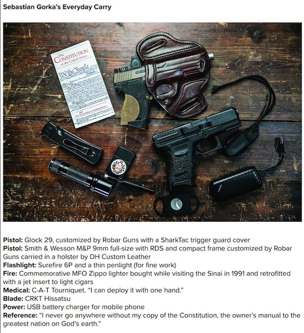 One particular fact about Gorka in the Recoil interview jolted social media. His "everyday carry" (EDC) - the items one carries on their person to ensure "utility and preparedness," according to the Everday Carry website - included an excessive assortment of weapons.