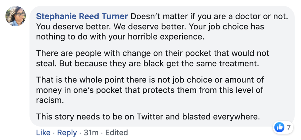 "Mind you, my bag isn't even large enough to fit a T-shirt. I emptied my entire bag in front of her, and since this was the SECOND time she had walked over, I said, 'I know you're just doing your job, but I can't help but wonder if this is because we're Black. We're the only Black people here at your establishment.'"