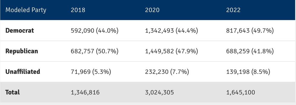 How does this stack up against prior years? Again, pretty decently for Democrats. In 2018, according to election analysis company TargetSmart, the party breakdown by this point was nearly exactly even at 45.7 / 45.8 / 8.6.