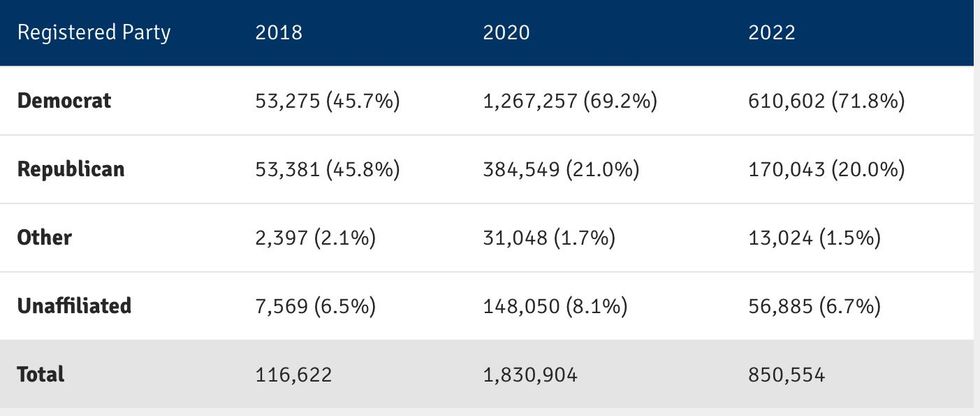 During the presidential election, which also saw a surge in interest for mail-in voting due to the pandemic, the numbers shifted dramatically toward the Democrats with a spread of 69.2 / 21.0 / 8.8.