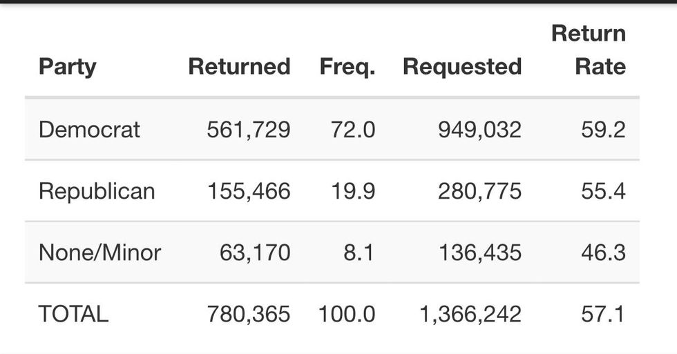More interesting to me is that the early voting data support enthusiasm for the Democratic Party in the state. As of the end of October, 780,546 mail-in ballots have been submitted.