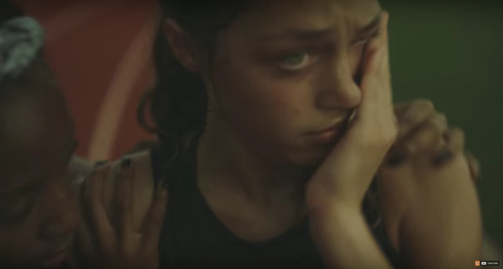 She lays out the benefits of sports as we see moving shots of girls playing soccer, basketball, volleyball, and running track. Because your teammates are your "allies," she says, "whether your bond is by blood or by ball, whether she shares the color of your skin or the color of your jersey."
