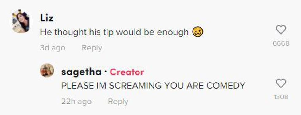 In this instance, the user who goes by Sagetha or @momitsyourbirthday on TikTok shared the text she sent to the customer who gave his phone number and called her cute but didn't give her a tip.