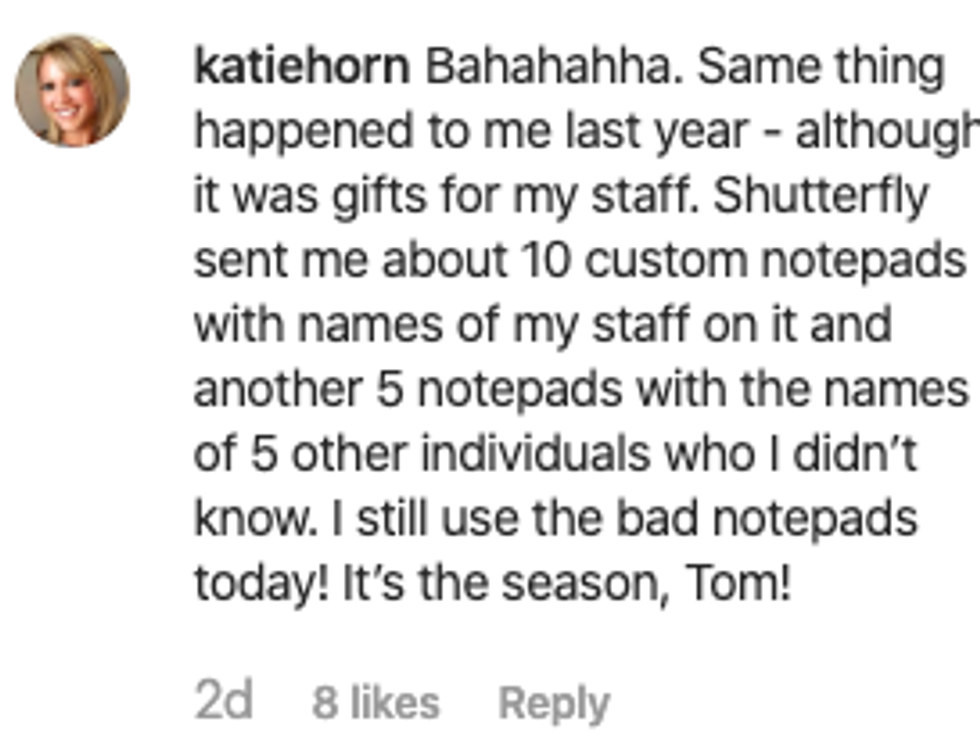 "The whole thing is a reminder that the true meaning of Christmas is things will go wrong and the best you can do is roll with it (we cut off the bottoms!). Also, if Tom and Ellen received the bottoms of OUR card just know that Frisbee is my wife's cousin and he is a DJ."