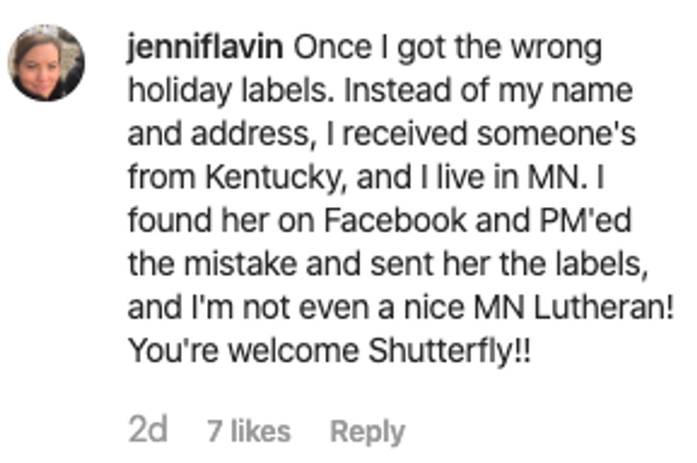 "Happy Holidays to Tom, Ellen and Peanut whose names were accidentally printed on the bottom of the Meyers family card."