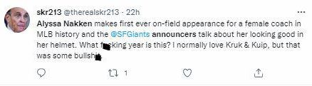 "Alyssa Nakken making history yesterday was really dampened by the commentators talking about how good she looked in her helmet and how she knows how to look good because of her softball experience."