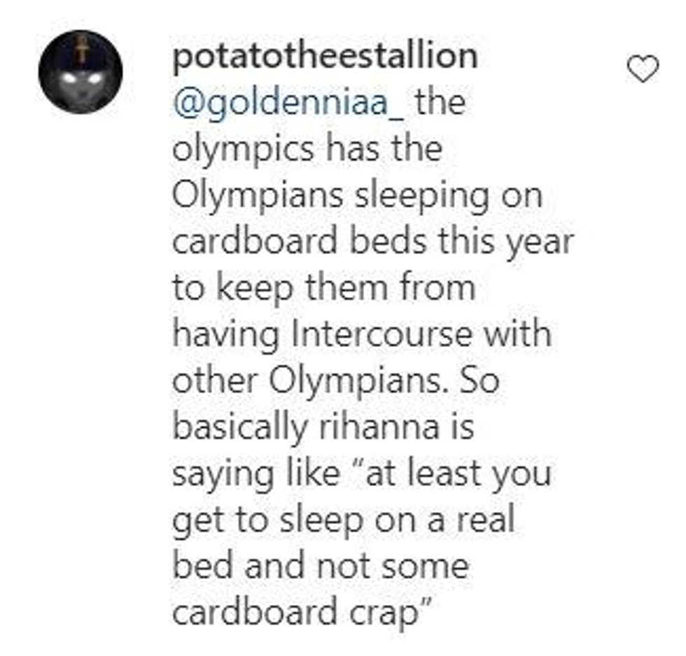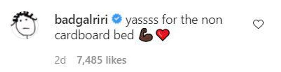 Rihanna took this as a chance to make a dig at the Olympics beds that are made of literal cardboard.
